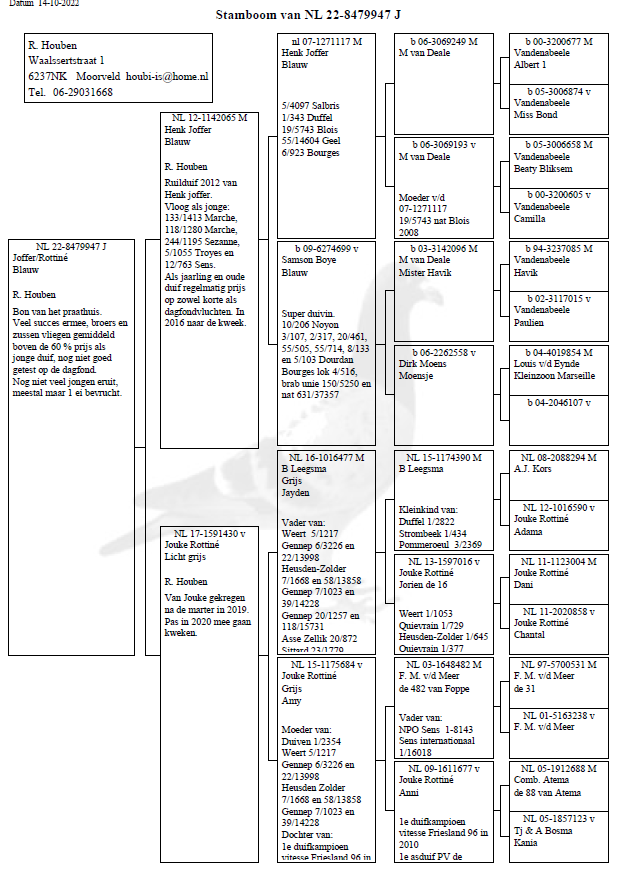 Een overnachtbon om van te watertanden! Goede wijn behoeft geen krans! Bob kweekt elk jaar toppers, en kenmerk van Bob is dat hij veel van die cracks niet zelf houdt, maar er anderen blij mee maakt. In 2016 kweekte Bob de Superbob, 3e duifkampioen Nationaal ZLU, met prijzen als (alles op nationaal niveau!) 56e Agen, 99e Pau, 31e St. Vincent, 24e Perpignan enz. Een duif om van te watertanden, en van dat soort en dat kaliber heeft Bob er veel meer! Er gaat geen jaar voorbij of Bob staat op Teletekst, en velen presteren met zijn duiven net zo goed als Bob zelf! Een miskoop is uitgesloten!